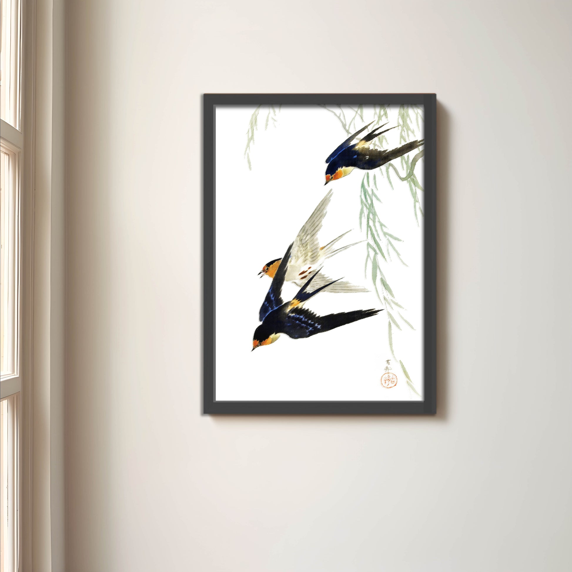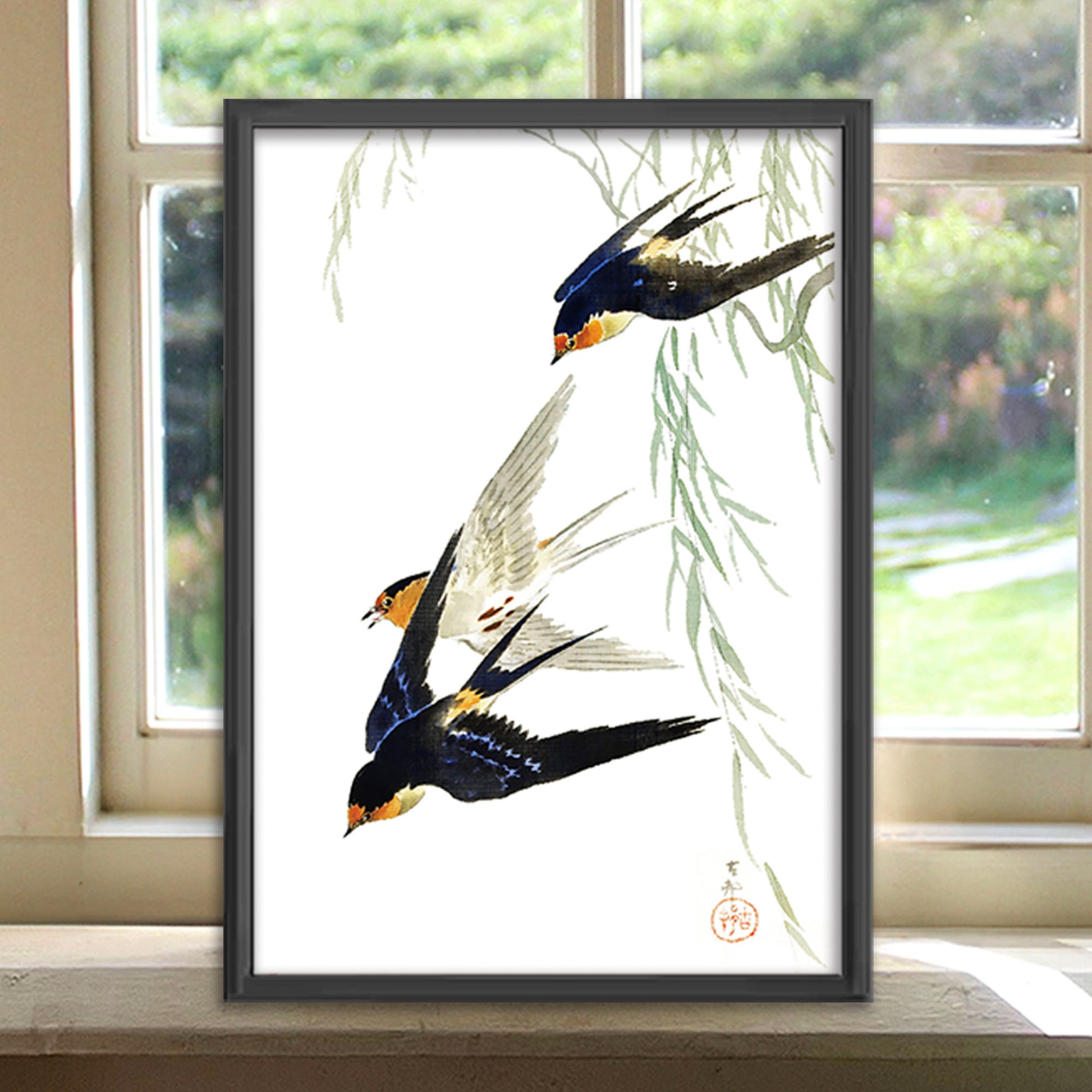柳とツバメ / 小原古邨 木版画複製 マット紙 A4 IKEAフレーム入り